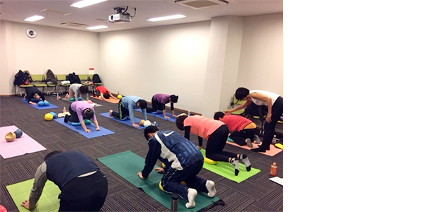 ボールの空気圧の加減で身体に受ける感覚はずいぶん異なります。ですから、私はその日の気分に合わせて空気圧を変えています。しかし、時々、ボールの不思議な弾力が想像を超えた気持ち良さや新鮮な身体感覚を与えてくれます。ボールは「生き物や!」と感じる瞬間です。この身体感覚の探求が面白いと感じる人達がここ日比谷に集まります。なので部屋の空間、雰囲気がとても心地よくて、この時間をいつも嬉しく思っています。
