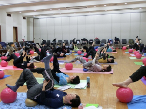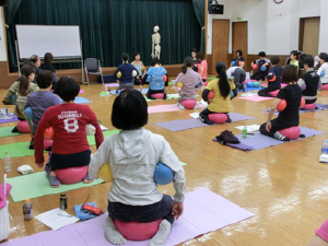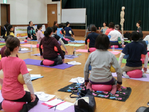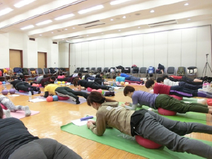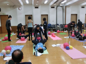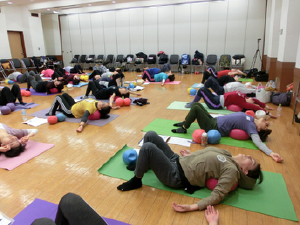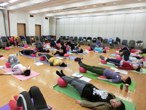 中尾スクールのメンバーさんから「正座が楽にできるボールはありませんか?」と聞かれたことがきっかけで、ギムニク30をカタログで見つけました。さっそく購入して試してみると、びっくりするくらい正座が楽にできます!ソフトギムニクより大きく、大きなGボールと性能は同じでしっかりした弾力です。ギムニク30を使っているうちにソフトギムニクでは充分に得られなかった可動域が得られることが分かり、また、場所を取らないので日常の中で簡単に活用できます。動きゆたかな生活を目指すシニアにこのギムニク30を広めたいと強く願いこのプログラムができました。そして、今日、林野会館で初のお披露目ワークショップとなりました。九州は大分・宮崎、東北は岩手からも、たくさん指導者が集まりました。感謝感激です!
