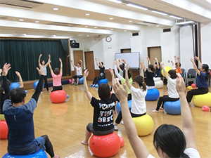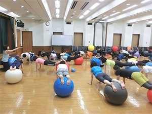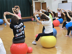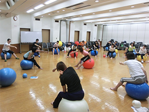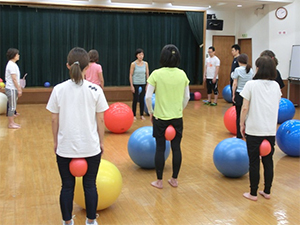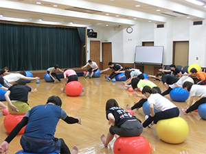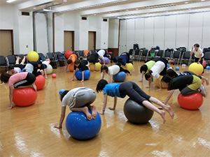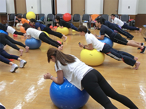 この講習会はスポーツ・グループ・パーソナルの3つの指導方法と実技を学びます。日常の生活の中でどのように活用できるか、また、どのように身体機能を高められるのかなど、私は「Gボールの概要」と「グループ指導におけるGボール活用法」を担当しました。Gボールの特性を十分に体感し、身体で理解してもらえるよう頑張りました。