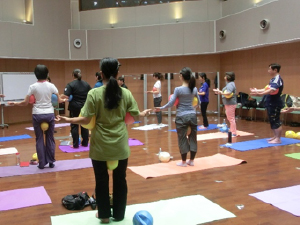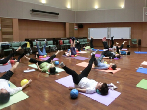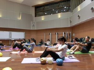 初めての方が数人参加されました。JSAボールエクササイズを気持ちよく体感してもらいたくて、このエクササイズの目的を伝えながらウォーミングアップしました。ボールの弾力が骨盤の位置や背骨のラインを整えます。また、生理的な準備だけでなく、身体に意識を向けて感じ取っていく集中力を高めていきました。