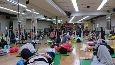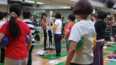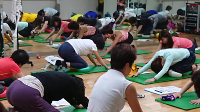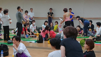 一人ひとりにマッチしたエクササイズにするために変化させるバリエーション要素を学び、それを使えるように練習していきます。練習したからすぐに活用できるということではないけれども、何のために何をするのか、そのためにどのように考え実行すればよいのか、バリエーション要素を使えるように考え試していきます。それをこれからの実際のレッスン現場で考え試しながら、経験を積み重ね指導スキルを磨きます。対象者は100人100様、一人ひとり違うからこそバリエーションは必要です。また、そのバリエーションを考えるのがとても面白い!面白いと感じるように皆でとことん集中し、考え、動きました。