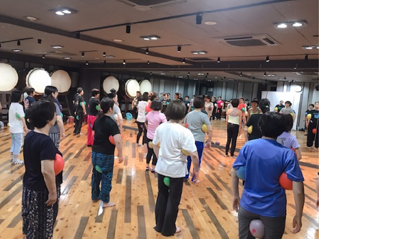 体験型解剖学ではお互いに身体に触れて、身体感覚を高めました。JSAボールエクササイズでは関節包がゆるみ関節の動きがなめらかになり、身体を軽く感じる体感をしました。その上で和太鼓を打つ!私も葵ちゃんもあまりにワークショップに集中したため、写真を撮ることを忘れてしまった。残念!大きな輪になって和太鼓を打った時、皆さんの身体感覚の変化がはっきりとわかって、とても嬉しかったです!好きなことのためには誰もががんばれるし、楽しめるし、喜びを感じます。とてもとても充実した時間になりました。ありがとうございました!