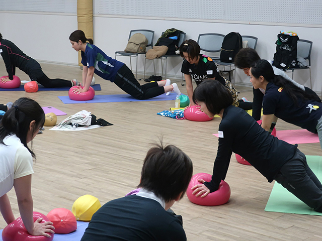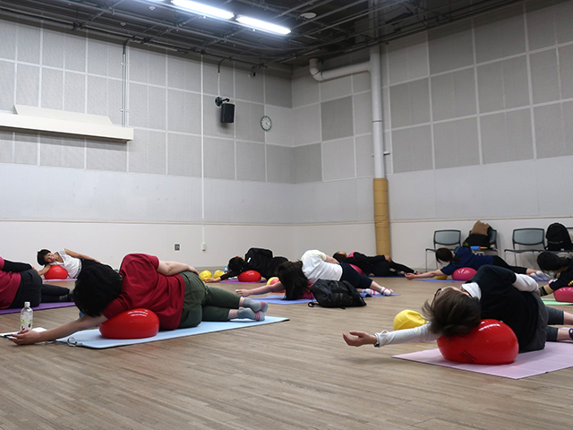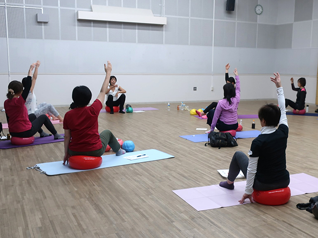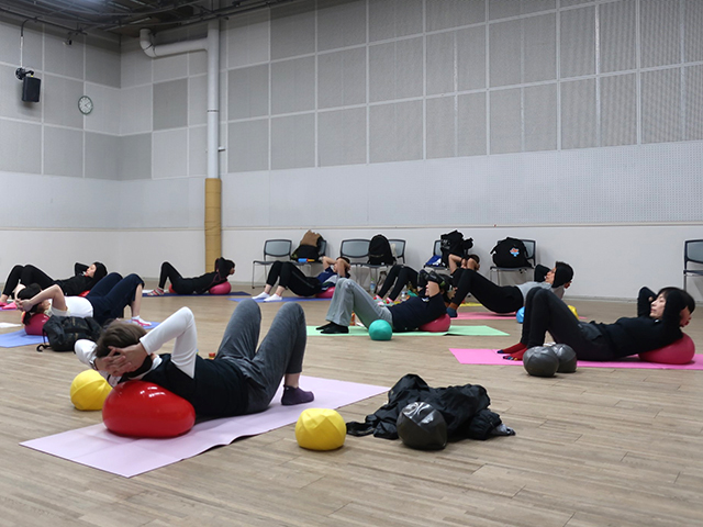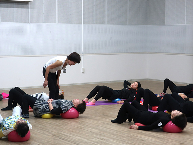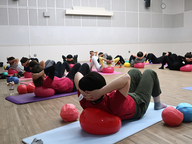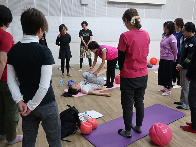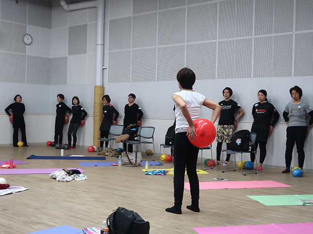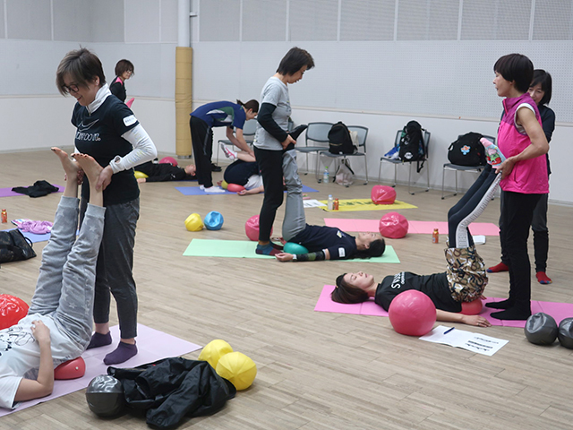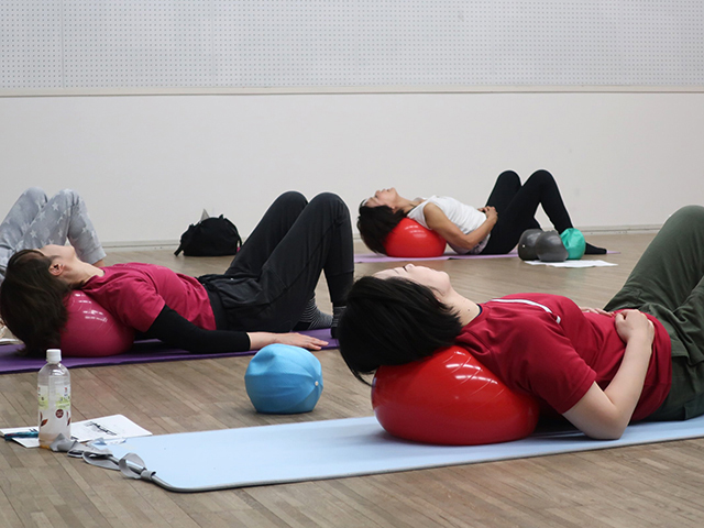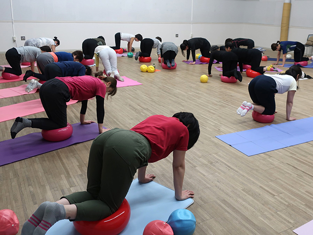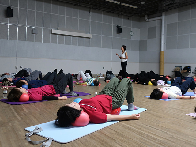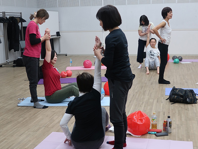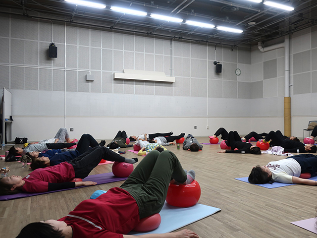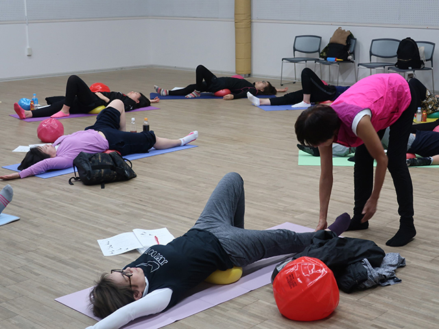 まず、一般の方と指導者が一緒のレッスンを2時間、そのあと指導者向け4時間セミナーでした。レッスンではギムニク30が初めての方も多く参加してくださいました。ボールが身体に触れる部分が大きいので、包まれる感じも大きく、とても気持ちいいと喜ばれました。ギムニク30は空気圧の変化で身体に受ける感覚が大きく異なります。その日の気持ちいいを空気圧の調節で簡単に探せます。日常の様々な場面での活用方法を体感しながら存分に楽しみました。