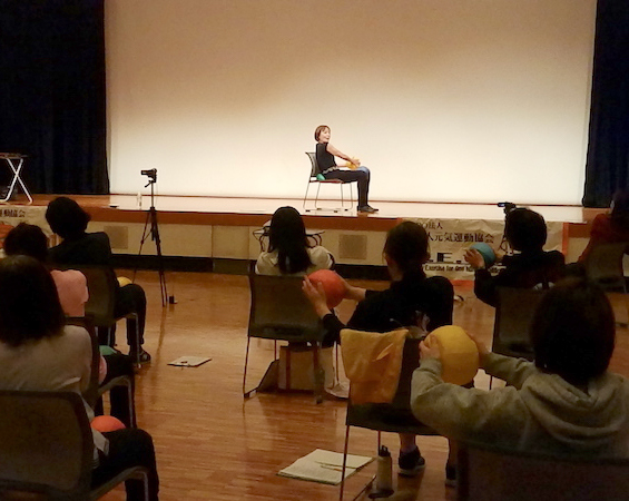 久しぶりに京都を出ての対面セミナーでした。ステージから参加者の距離はなんと6メートル!遠い!しかし、JSAボールエクササイズが初めての方もたくさん参加してくださったので、少しでも心地よさを体感してもらいたいと集中しました。元気協会といえばチェアエクササイズです。今回は「高齢者指導に活かせるJSAボールエクササイズの実際」というタイトルで椅子でのJSAボールエクササイズを紹介しました。関節運動学やJSAメソッド、ボールの特性や活用の仕方まで、90分では到底納まらない内容でしたが、皆さんとても熱心に受講してくださいました。ありがとうございました!