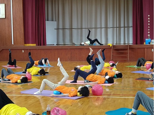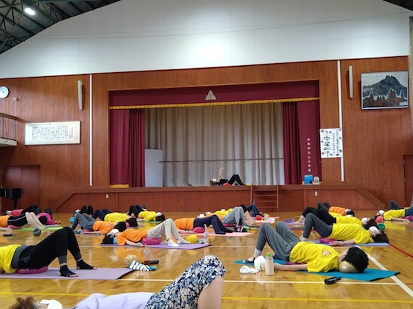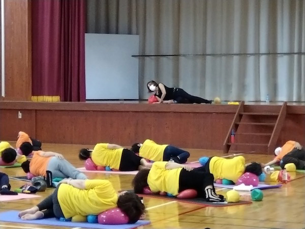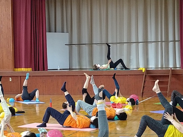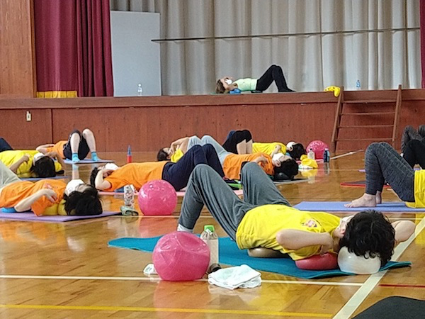 とても熱い2日間になりました。今までは1レッスンだけだったのですが、今年はなんと3レッスン!ほとんどの方が3本ともに参加してくださいました。また、仕事や用事の合間をぬって参加された方もいて、にぎやかで、和やかで、皆でじっくり、しっかり動きました。驚いたことに70〜80才代の方々も全く平然と動かれるんです!その様に嬉しすぎて、私の気持ちは舞い上がりました。あらためて普段が大事なんだと思いました。小田さんの熱心な指導のもと、皆さんが楽しんで身体と向き合い動かれていることがわかります。今回は全員がJSAボールエクササイズ愛好者、ボディマッピングやエクササイズ説明の必要もなく、皆さんの身体への意識レベルが高くて、伝えたいことがすんなり吸収してもらえている手応えがありました。こみあがってくる喜びと感激で幸せすぎる時間でした。心から皆さんに拍手します!すごい!