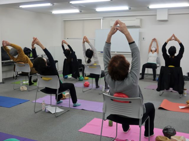 イスの背もたれは様々に活用できます。左はボールを当て胸椎の伸展をしながら呼吸運動とともに肋椎関節に働きかけています。右は脊柱の屈曲と伸展、肩関節のストレッチも兼ねています。